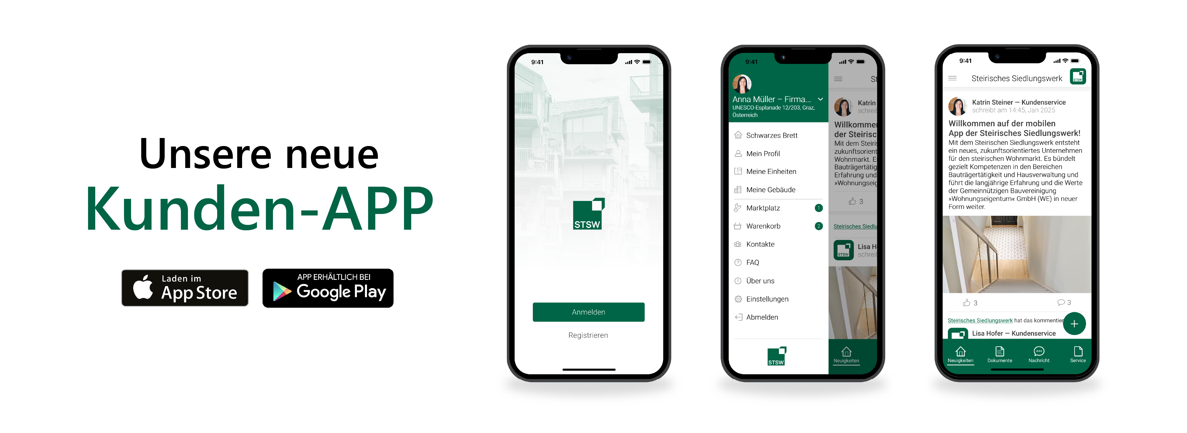 Als Kund:in der Steirisches Siedlungswerk Gemeinnützige Wohnungsges.m.b.H. profitieren Sie von einem besonders innovativen Service, der Ihnen viele Freiheiten bietet. Mit der Steirisches Siedlungswerk App können Sie uns, egal um welche Uhrzeit, Ihr Anliegen und Schäden inklusive Fotodokumentation per Smartphone melden. Außerdem stellen wir Ihnen eine digitale Dokumentenmappe mit wichtigen Dokumenten für Ihre Immobilie(n) zur Verfügung. Durch das digitale schwarze Brett informieren wir Sie via Push-Nachricht proaktiv über wichtige Informationen rund um die uns anvertrauten Immobilien.